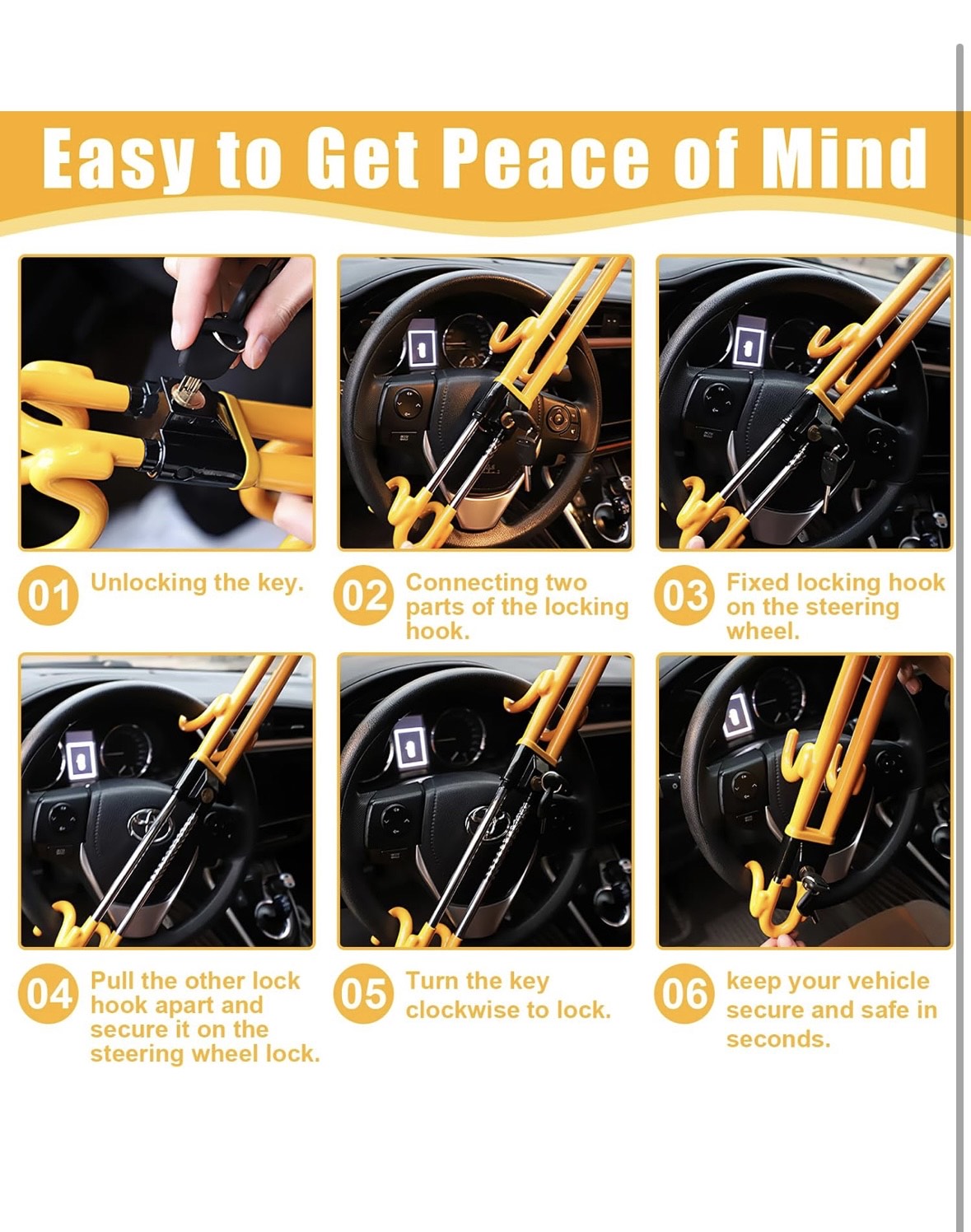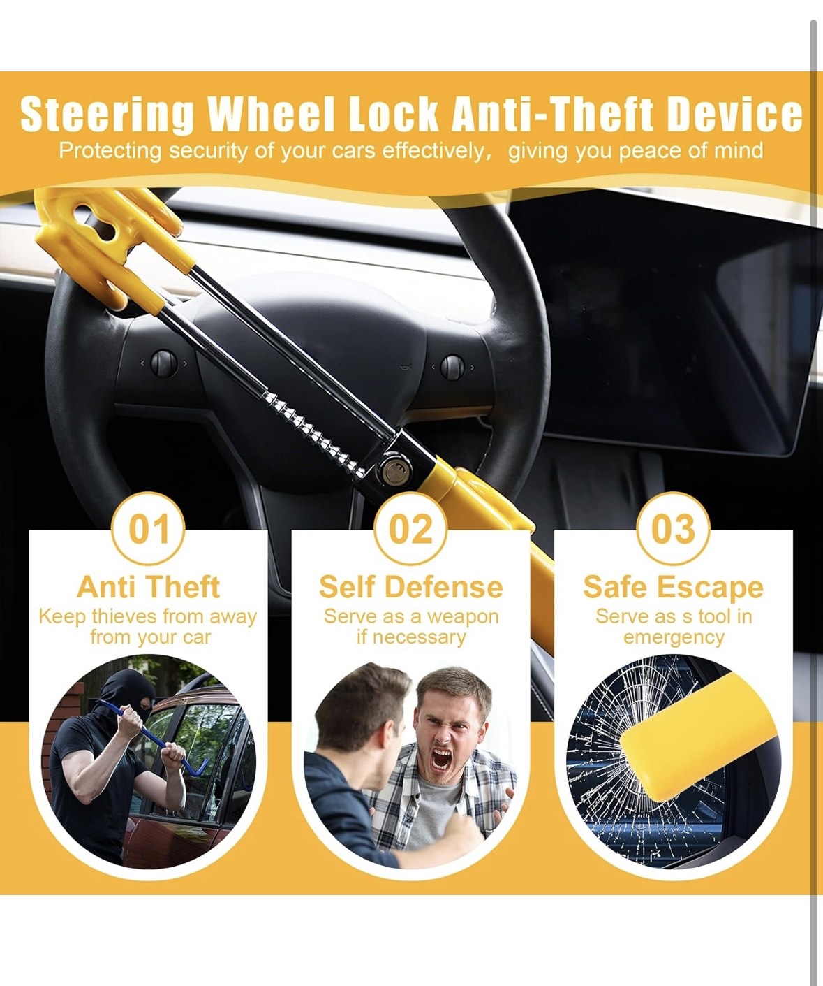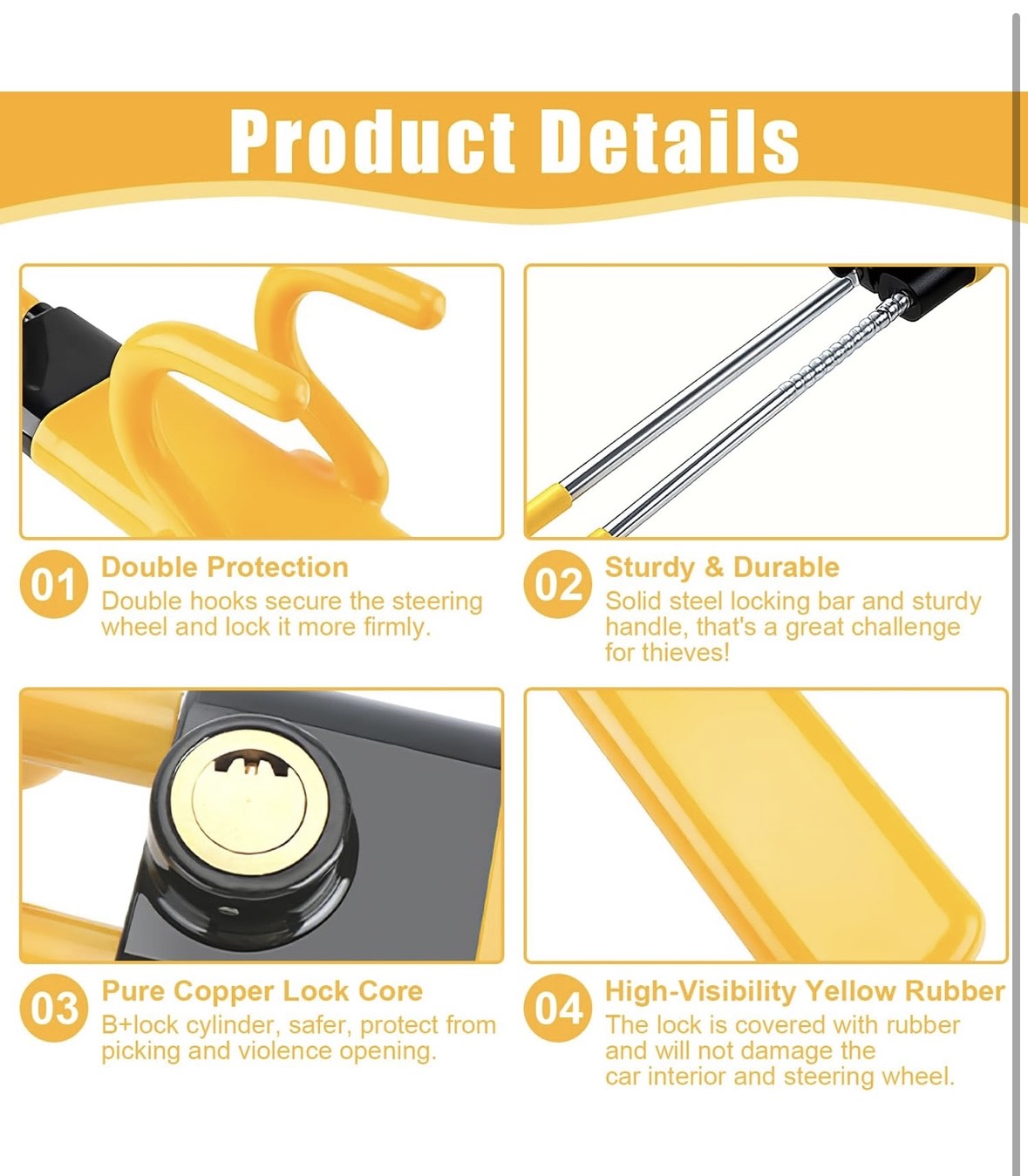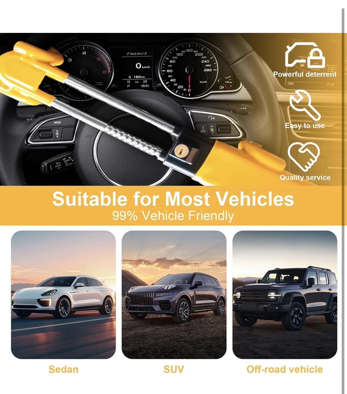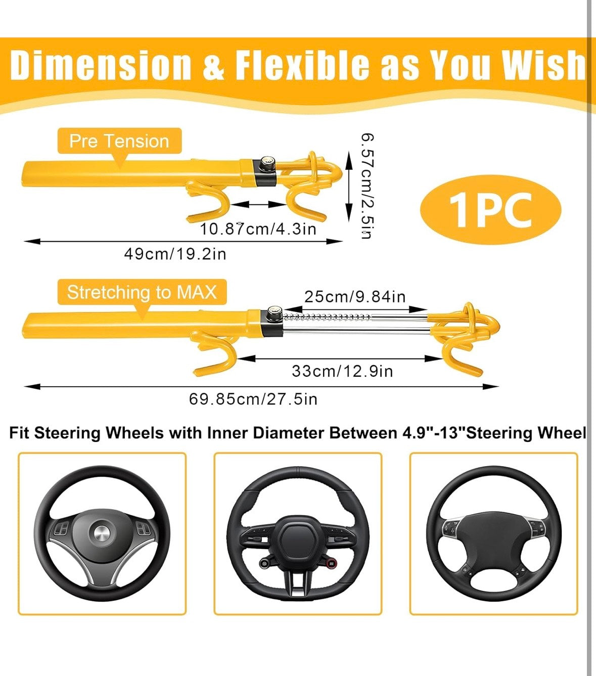 Chraňte své vozidlo pomocí tohoto dvouramenného zámku volantu – spolehlivého bezpečnostního řešení proti krádeži určeného pro automobily, dodávky a nákladní vozy. Díky odolné, výsuvné konstrukci se dvěma rameny poskytuje silný vizuální i fyzický odstrašující efekt. Zámek je dodáván se dvěma klíči a nabízí univerzální kompatibilitu s většinou volantů, což zajišťuje snadnou instalaci a bezpečnou ochranu vašeho vozidla.