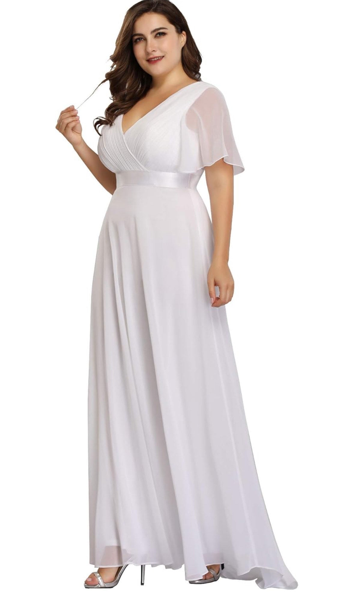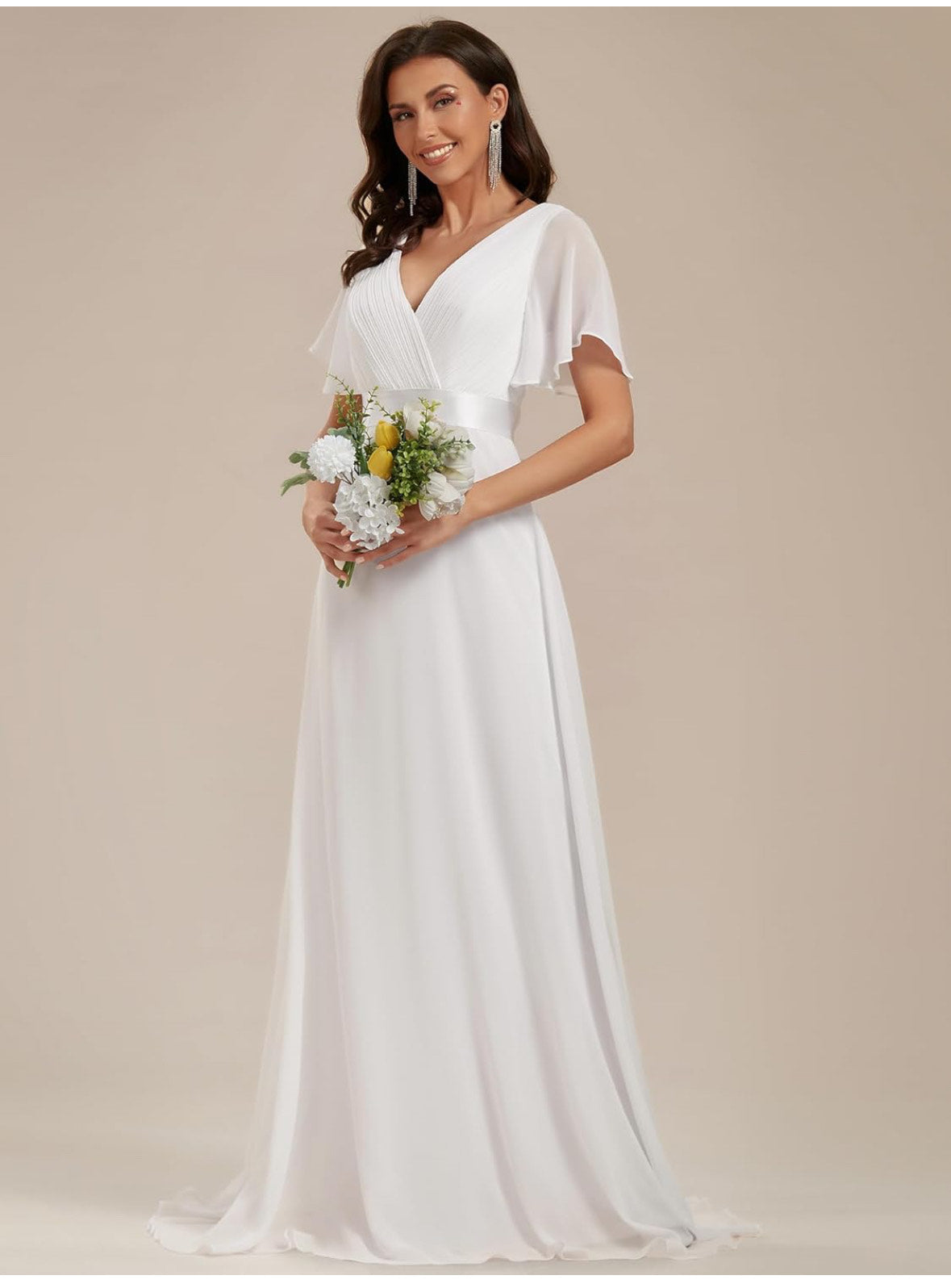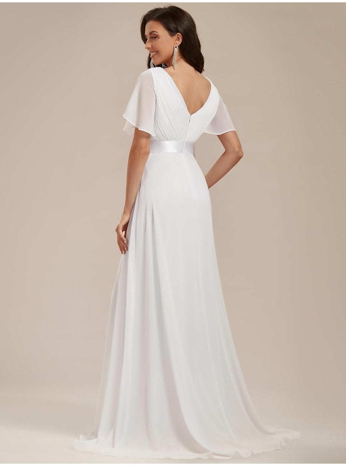 Nadčasová elegance se snoubí s nenuceným půvabem ve večerních šatech Ever-Pretty, které se pyšní jemným dvojitým V výstřihem, něžnými krátkými vzdušnými rukávy a lichotivým empire pasem. Vyrobené z lehkého, splývavého šifonu, tyto dlouhé šaty nabízejí elegantní siluetu, která je ideální pro svatby, formální události, večírky a zvláštní příležitosti.