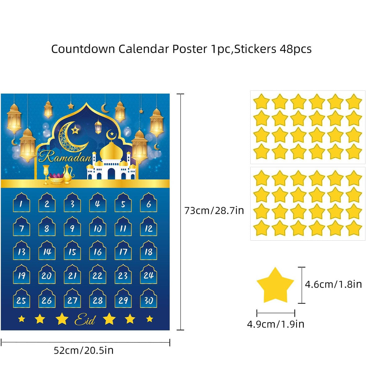 Ramadánský odpočítávací kalendář pro děti – Eid kalendář s aktivitami a 48 znovupoužitelnými hvězdami (modrý)