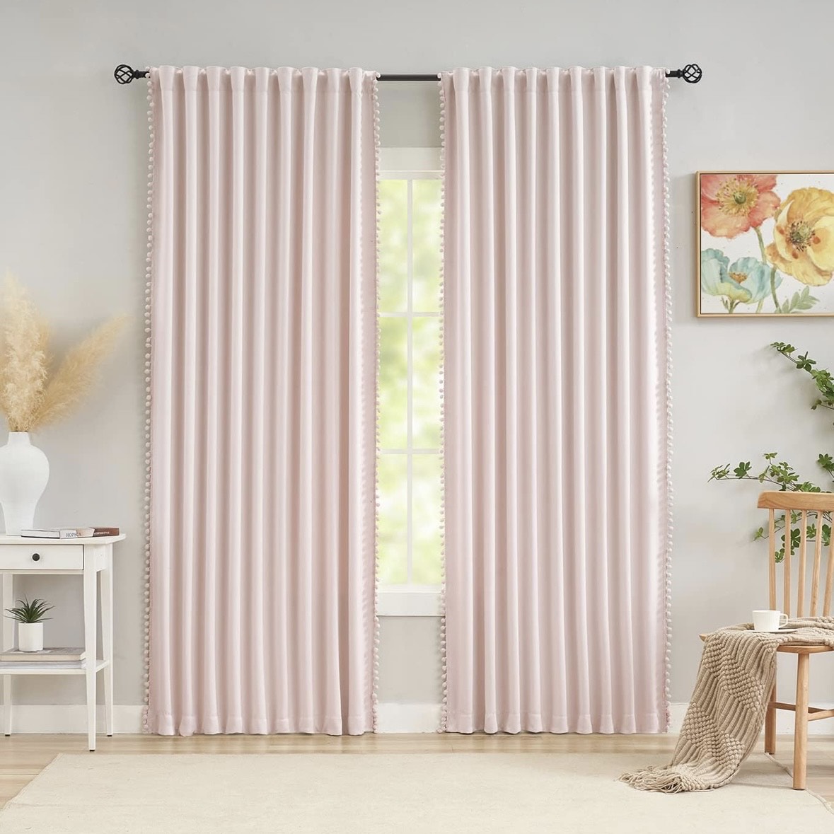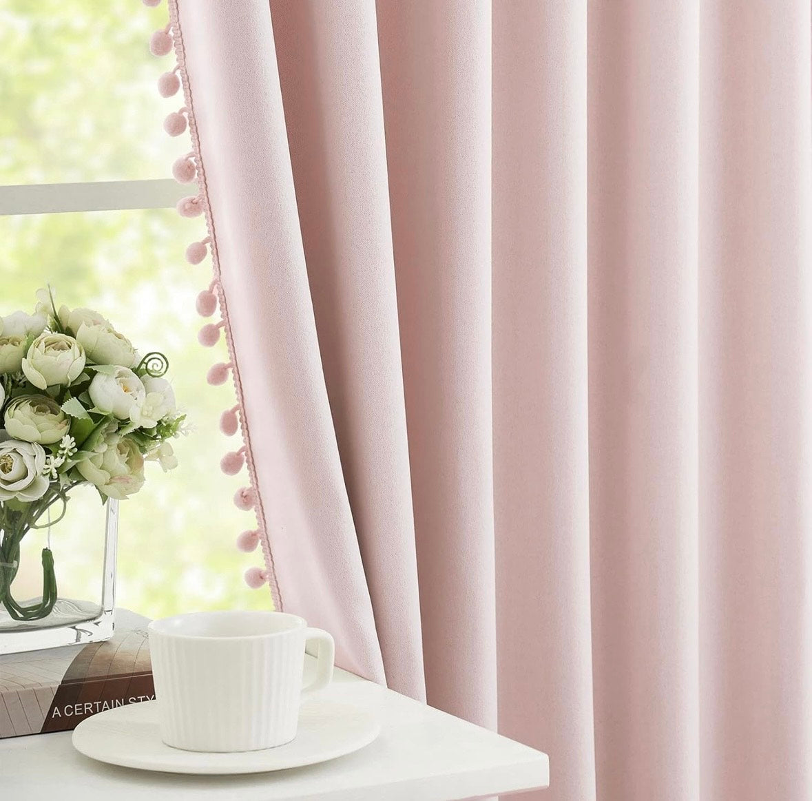 Růžové Polozatemňovací Závěsy s Bambulkami – Sada 2 Panelů (127 cm šířka x 137 cm délka každý)