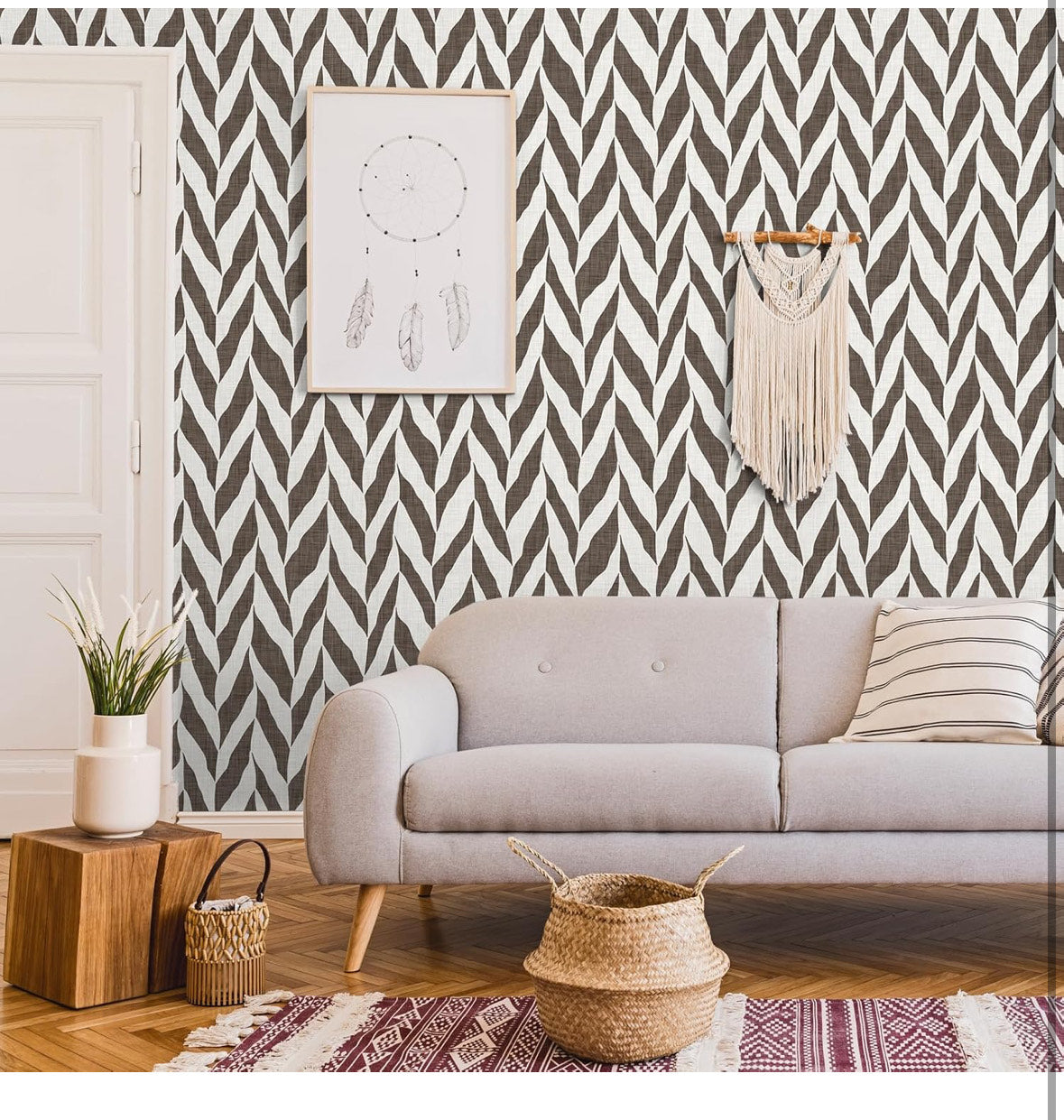 Přidejte každému prostoru nádech moderního boho šarmu s tapetou Veelike Brown Chevron Geometric.