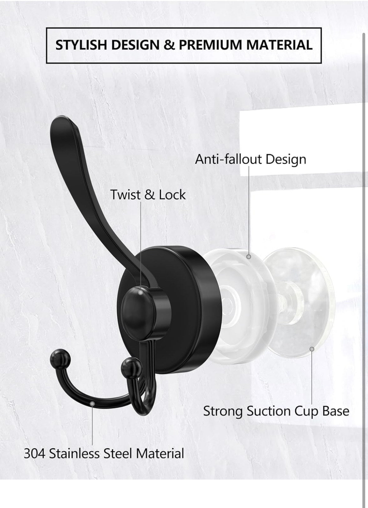 Einesin háčky s přísavkou – 2 ks, odolné koupelnové háčky bez vrtání (černé)